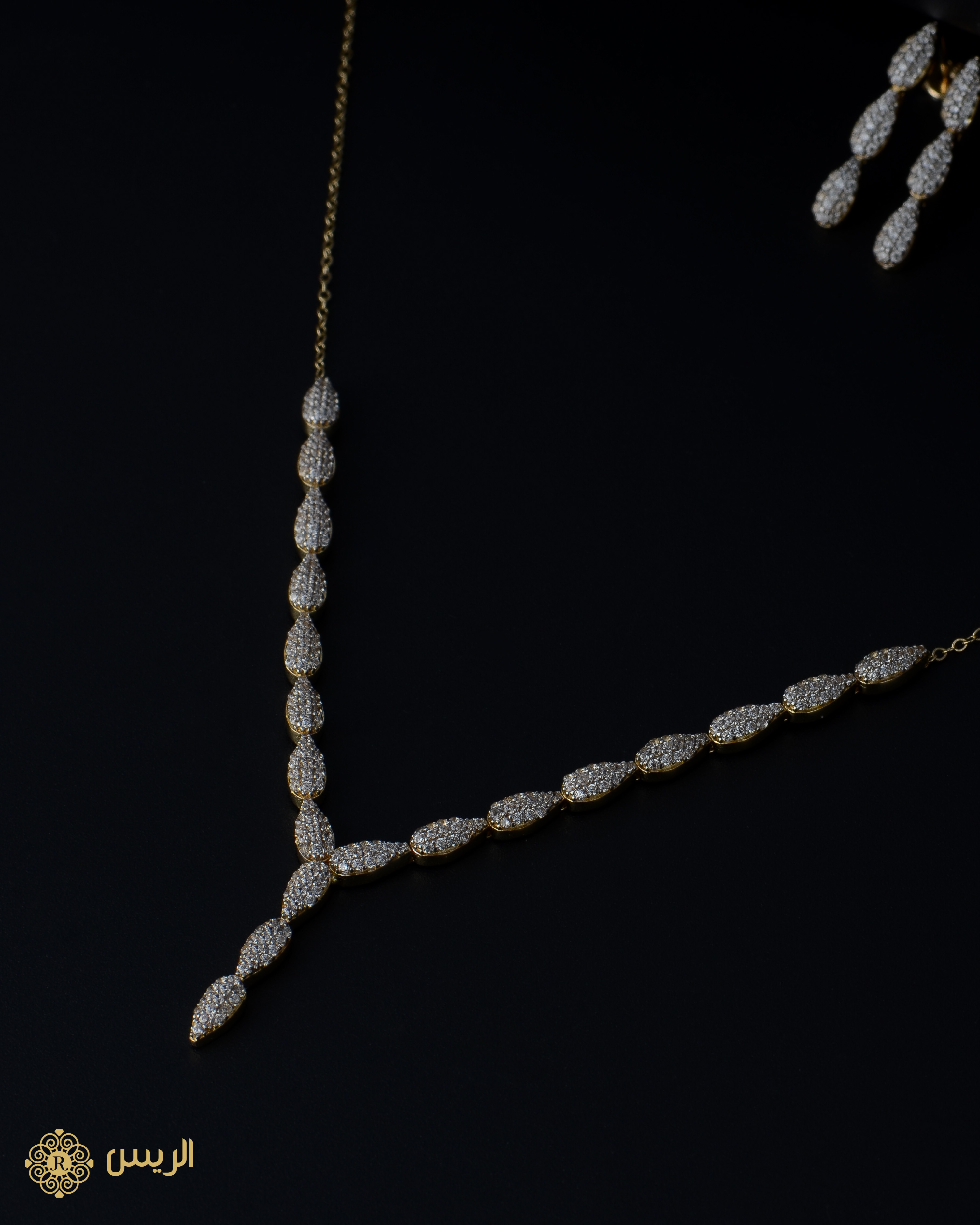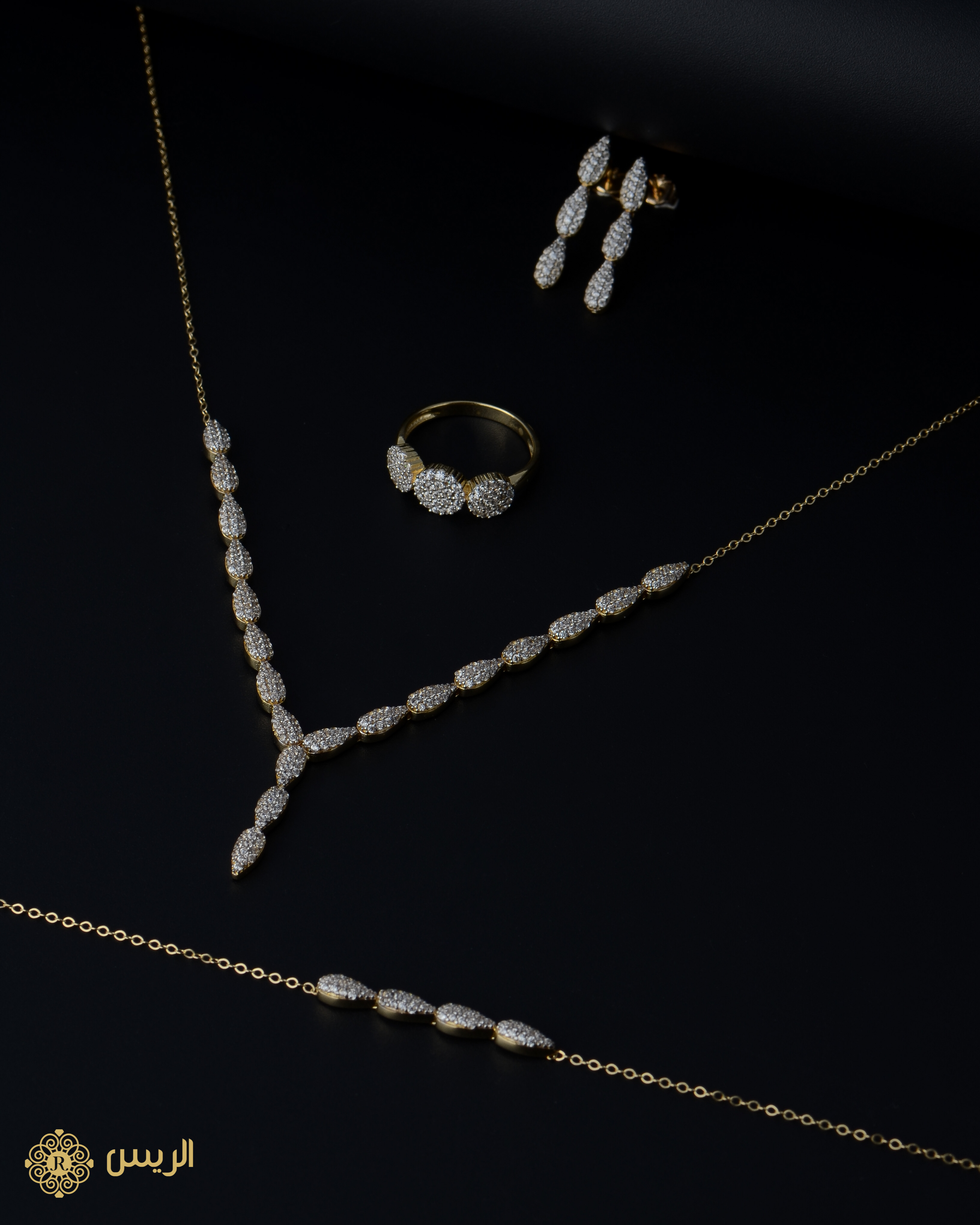 طقم ناعم تصميم كلاسيكي (أربعة قطع) بفصوص زركون. عرض العقد: 11 سم طول الإسورة (الإنسيالة): 20.5 سم مقاس الخاتم: 15 طول الحلق: 2 سم